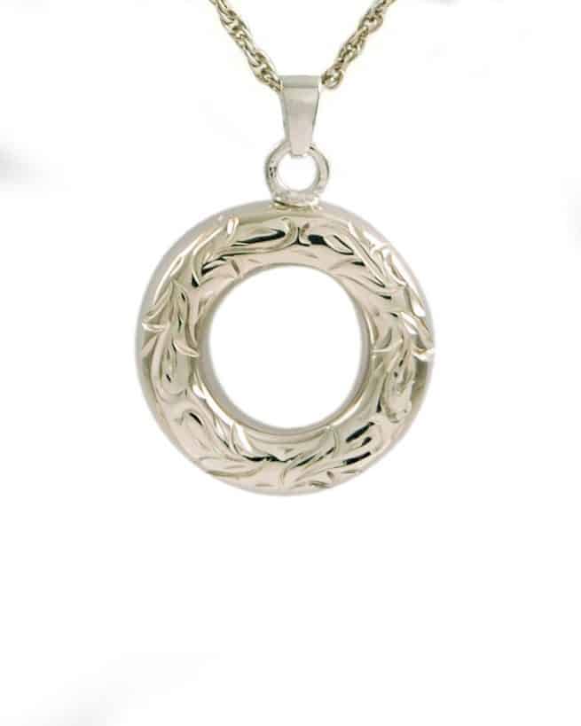 This alluring sterling silver round pendant can hold a small amount of one’s cremains. This pendant comes on an 18″ matching chain.